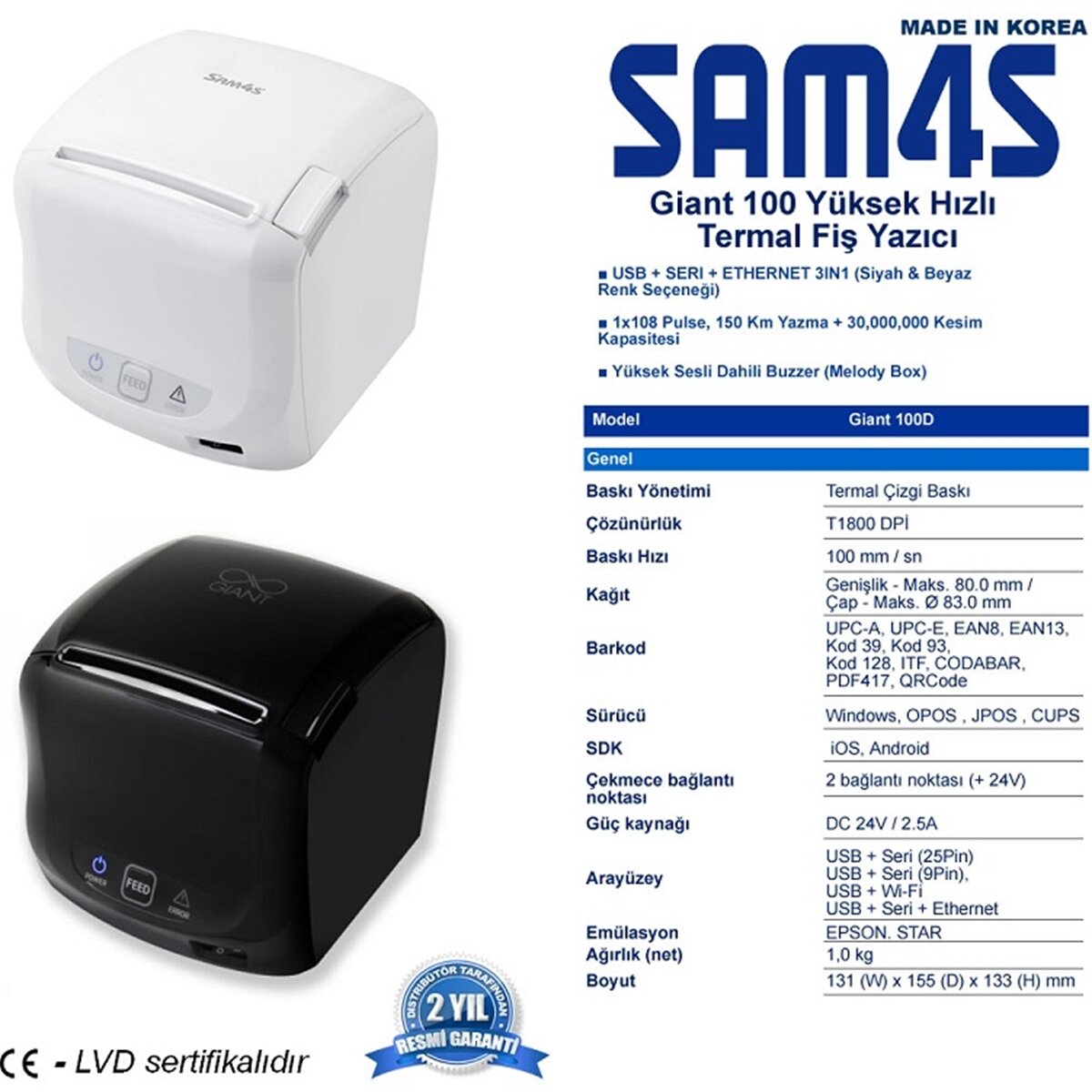 Sam4S Giant100D Eth + Usb Siyah Termal Fiş Yazıcı